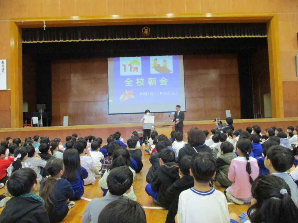 本日,11月の全校朝会がありました。給食委員長の「寒くなってきましたが負けずに元気に頑張りましょう」という口上のあと、あおぞらあいさつで始まりました。今月の歌「はじめの一歩」を元気に歌って,夏休みの工作を出品した北区作品展で優秀賞とった5年生を表彰しました。校長講話は,4つのあいの中で一番難しい「高め合い」について,自分と違った考えの人との話し合ってお互い高め合おうという話でした。秋がふかまる11月,学習や活動でたくさん実りがあると「いいね!」