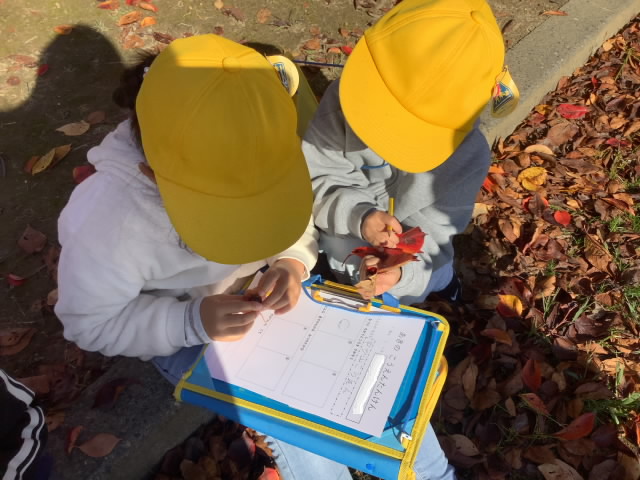 本日,絶好の秋晴れの中,1年生が2回目の中嘉山公園の探検に行ってきました。前回の夏の6月と比べながら,秋の実や葉っぱをじっくり観察し,しっかり記録しました。深緑の6月と紅葉の11月,二つの公園の姿をたっぷりと味わうことができて「いいね!」