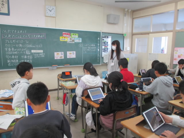 6年生の家庭科では,給食の献立について学習していました。献立は栄養バランスはもちろん,色合いを考えたり,地場産を使ったりといろいろな工夫があります。一汁二菜という条件の中で,自分たちで献立メニューを考えている姿が「いいね!」