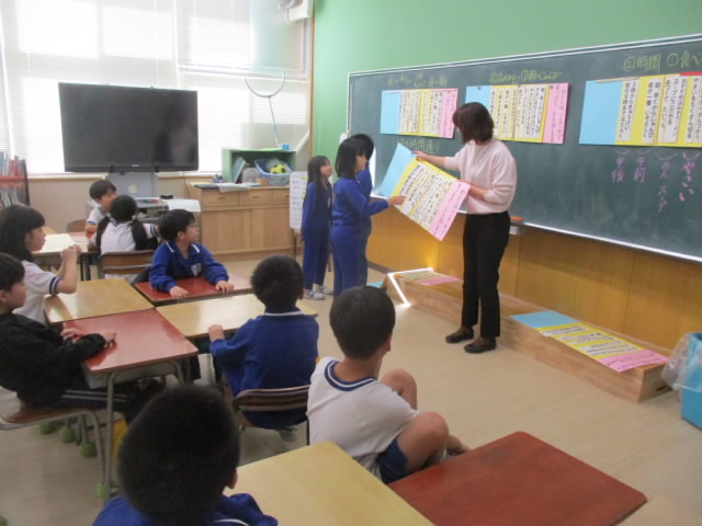 2年生は,国語で「町で見つけたことを話そう」という学習をしています。生活科の町探検でたくさんみつけた「キラリ!」今日は,キラリをどういう順番で話したらいいかをみんなで話し合いながら,組み立て表を作っている姿が「いいね!」
