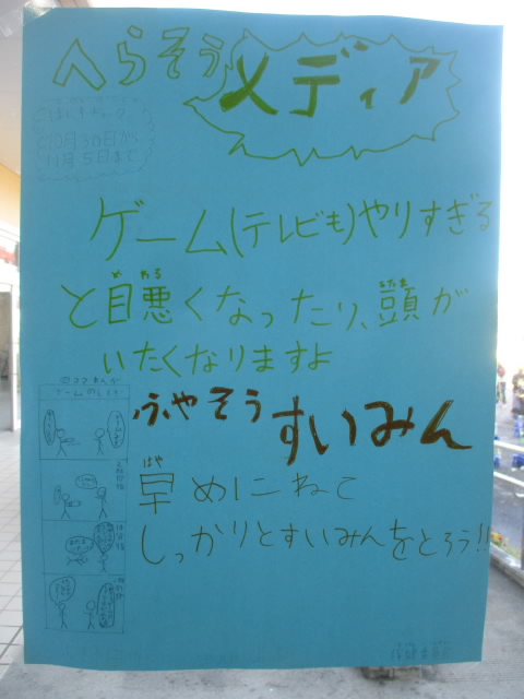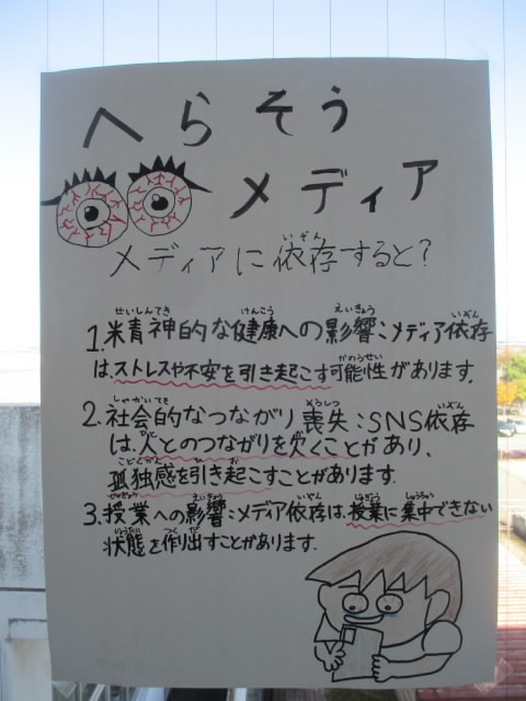 保健委員会が自作のポスターを掲示し,メディアコントロールの啓発活動をしています。ゲームやメディアの長時間視聴の弊害をまとめたり,クイズにしたり,標語にしたりして呼び掛けています。「へらそうメディア,ふやそうすいみん」の標語が「いいね!」
