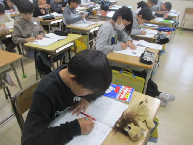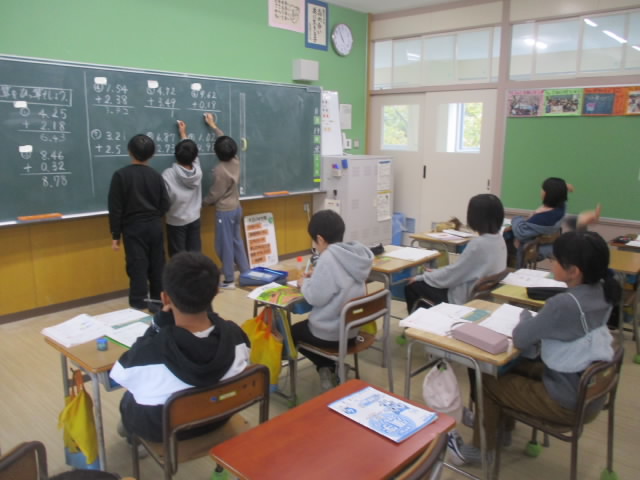 4年生の算数は,少数の足し算を筆算で行う学習をしています。何人かの代表から黒板で計算してもらい,計算の仕方を確認しました。最後は,1人1人がドリル問題を集中して計算している姿が「いいね!」