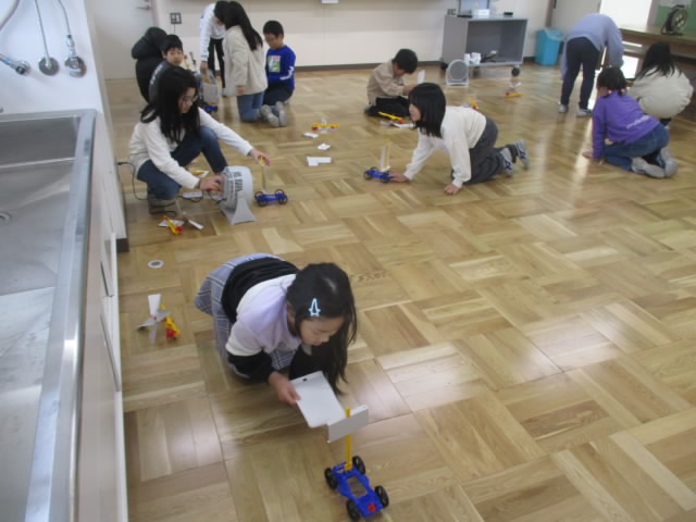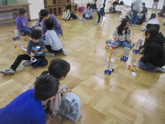 3年生の理科「風のはたらき」の学習も佳境に入っています。風車付きの台車と帆のあるヨット型の台車の二つを作り,どちらが風を受けて進むか比べていました。図工室で広々と実験ができて「いいね!」