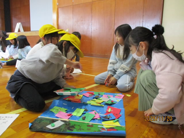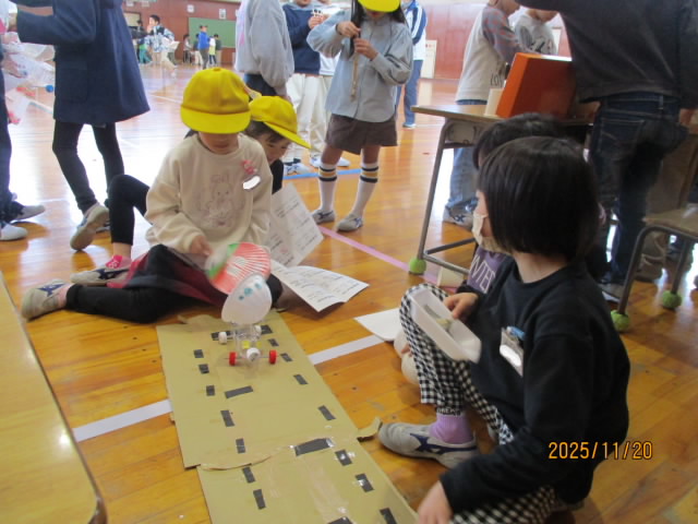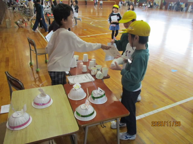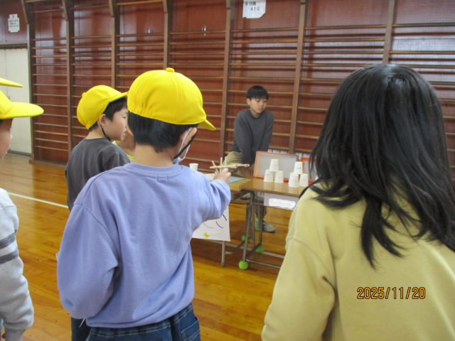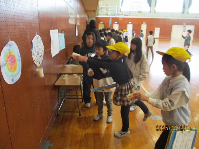 本日,2年生が1年生を「おもちゃランド」に招待しました。これまで生活科の時間に,練りに練った工夫満載のおもちゃを手作りしてきました。各学級で,学年でのリハーサルを重ねて,満を持しての「おもちゃランド」の本番。細工は流々,1年生もたっぷり楽しんでいました。ゲームのやり方を丁寧に教えている2年生の姿が頼もしくて「いいね!」