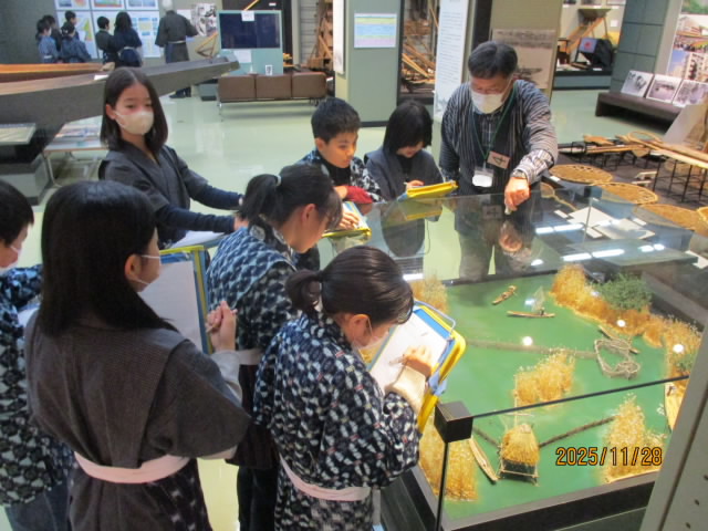 昨日と本日,4年生が社会で北区郷土博物館へ校外学習に行ってきました。ちゃんちゃんこ風の服を着て,学芸員さんから福島潟の干拓の様子や昔の農具について説明を受けました。タイムスリップした雰囲気の中で熱心にメモをとっている姿が「いいね!」
