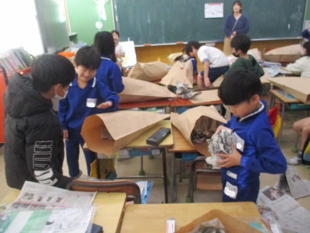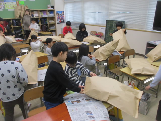2年生図工の工作の名物と言える「くしゃ くしゃ ぎゅ」がはじまりました。大きな紙袋の中に,くしゃくしゃに丸めた新聞紙を詰め込みます。これから,大きく膨らんだ紙袋に,どんな造形や装飾をしていくか,完成が楽しみで「いいね!」