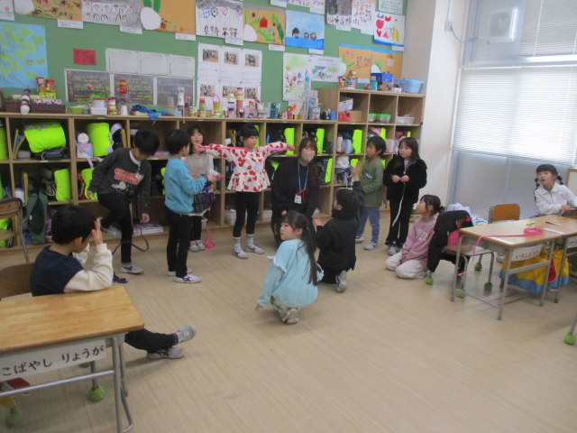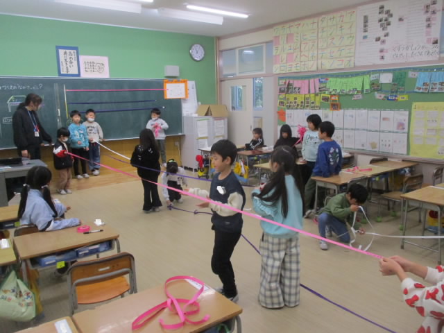 1年生は算数で「くらべてみよう」という学習をしています。まず比べるのは物の長さ。今日は紙テープを使って,教室中のある場所や物の長さを比べてみました。友達の紙テープはどの部分の長さなのかを予想し合っている姿が「いいね!」