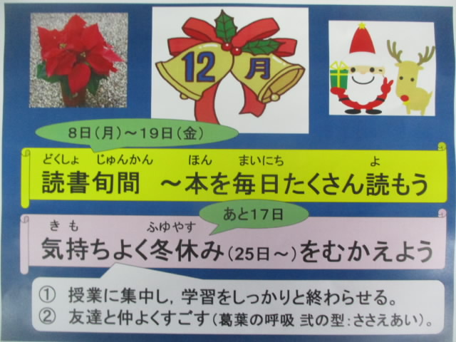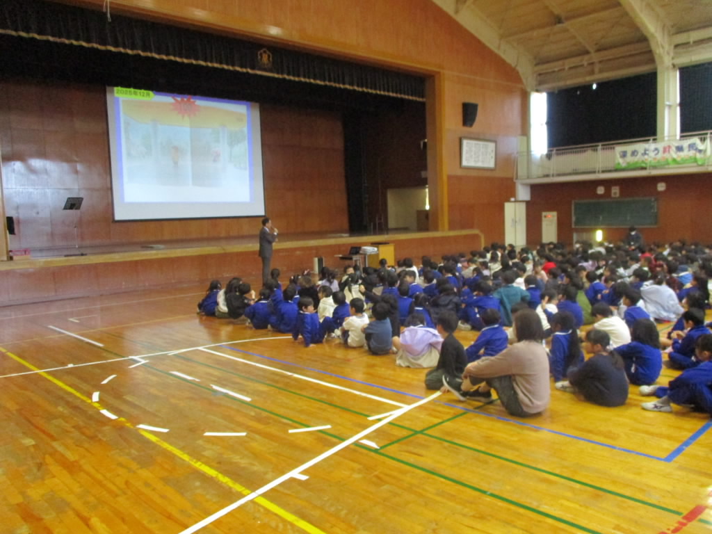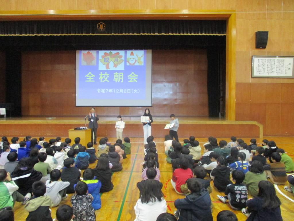本日,12月,令和7年最後の全校朝会が行われました。栽培委員長の先導であおぞらあいさつをした後,11月の歌♪赤い屋根の家♪を全校で気持ちよく歌いました。その後,全国競書大会硬筆部門と人権ポスター展で優秀な成績を収めた児童を表彰しました。