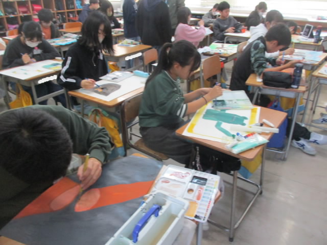 6年生の図工では,小学校最後の絵画作品を描いています。これまで国語で読んだ物語の思い出の1場面が画題です。2年生の「お手紙」4年生の「ごんぎつね」,5年生「プラタナスの木」など懐かしい場面を思い出しながら描いている姿が「いいね!」