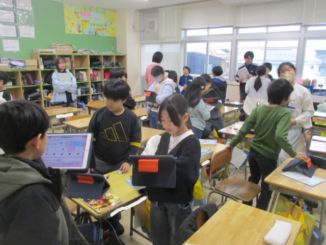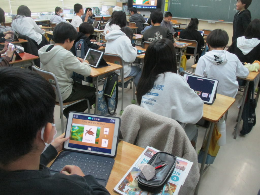 6年生は,Save the animals という学習で,動物を絶滅に追いやる環境問題を言語材料に学んでいました。~ is a big problem. We can ~. と自分たちができる解決方法を英語で書いたり話したりしているところが「いいね!」