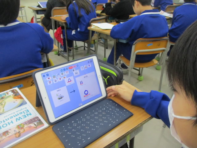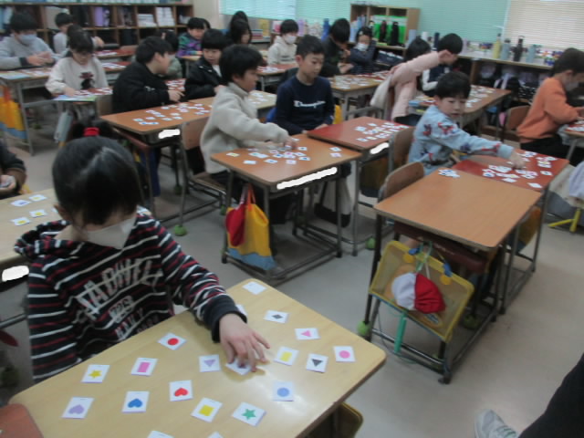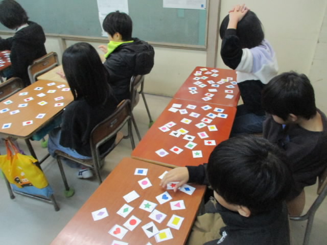 3年生は,color and shape という学習で8つの形と5つの色を言語材料に学んでいました。机上に40枚のカードを並べて,先生が発問した形と色のカードを取るセルフカルタで盛り上がって「いいね!」