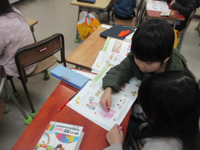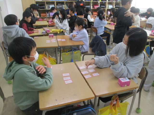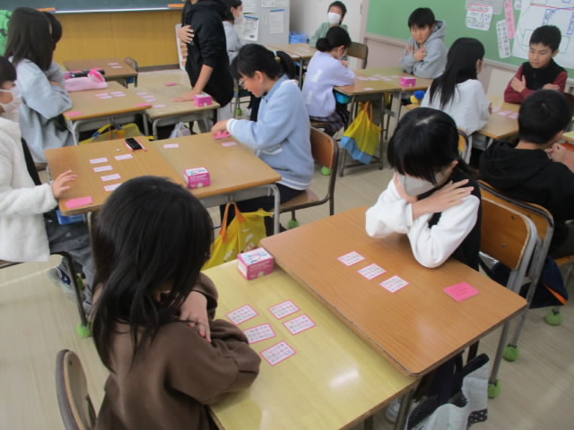 4年生は,国語の時間に百人一首を楽しんでいました。先生が読み上げる一首をよく聞いて,下の句が書かれている札を取ります。五七五七七のリズムを感じながら,見つけた札に素早く手を伸ばす姿が「いいね!」