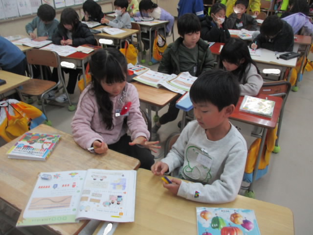 1年生の算数は「くらべよう」の学習で,長さくらべ,かさくらべに続いて,最後は広さくらべをします。ペアでジャンケンをして勝つとマス目をぬるベームで,どちらが広いか,マスを数えて比べている姿が「いいね!」