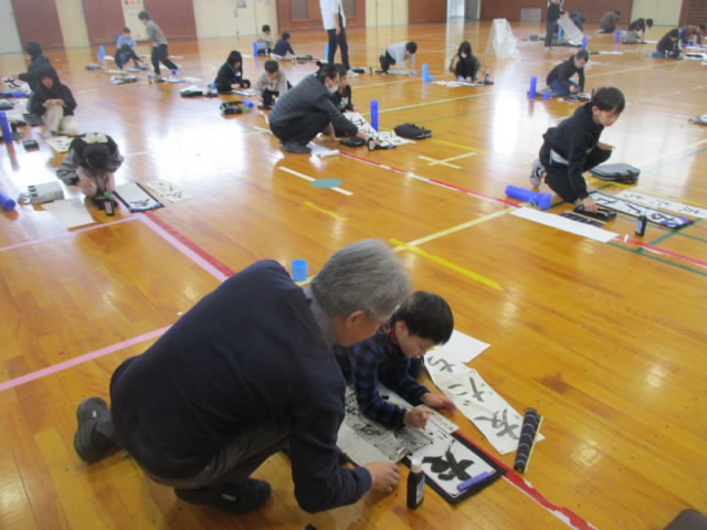 学校では,書写の時間に書き初めの練習が始まっています。本日,初めて書き初めに挑戦する3年生は,広い体育館でのびのびと「友だち」を書きました。今年度も石田先生から一人一人にアドバスをしていただけて「いいね!」