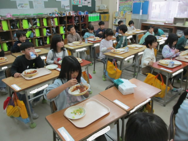 今日の給食は,アフリカ風メニューが提供されました。マフェは,セネガルを中心とした西アフリカの家庭料理で,トマト風味のシチューです。カチュンバリは,ケニアを中心とした東アフリカでよく食べられる生野菜サラダです。1年生もおいしそうに食べています。明日の朝は,お話玉手箱さんから1年生がアフリカにまつまるお話を読み聞かせてもらえて「いいね!」