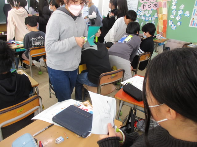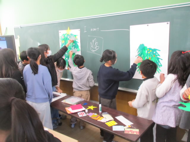 5年生の外国語科では,手形クリスマスツリーを制作していました。緑の折り紙を自分の手形に切り取り,手形の平に名前と自分の欲しいものをI want ~の構文で書きました。緑の手形がもみの木みたいになって「いいね!」