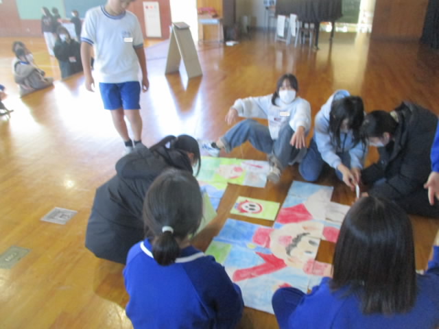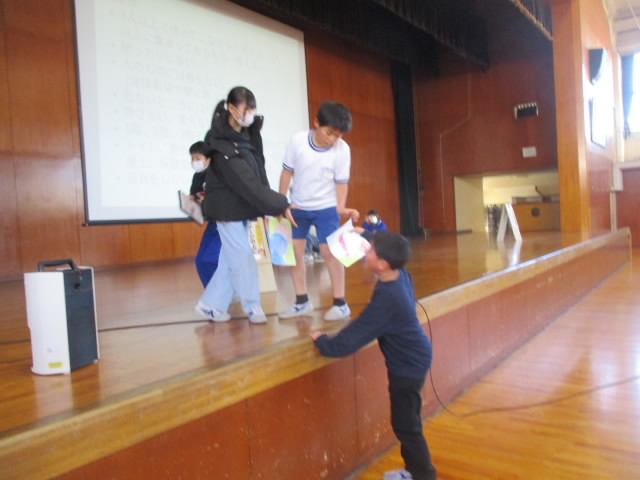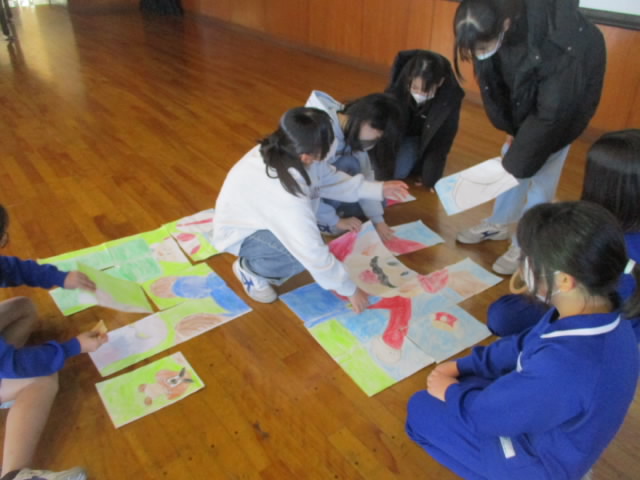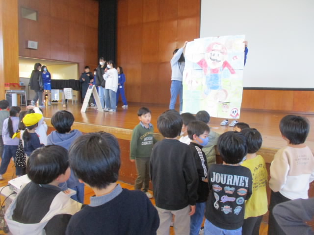 本日の昼休み,児童会の運営委員会主催の全校宝探しゲームがありました。ある絵をバラバラにしたピース図が校舎内にたくさん隠されています。3人組以上で校舎内を回り,ピースを探して体育館持ってきます。それを張り合わせるとあおぞらスーパーマリオが完成!「いいね!」