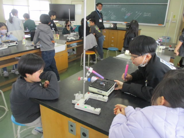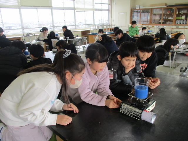 4年生理科の「ものの温まり方」の学習は,金属の次は水(液体)です。試験管とビーカーを使った2種類の実験を行います。どの部分からどのように温まるか,示温インクの色の変化を集中して観察している姿が「いいね!」
