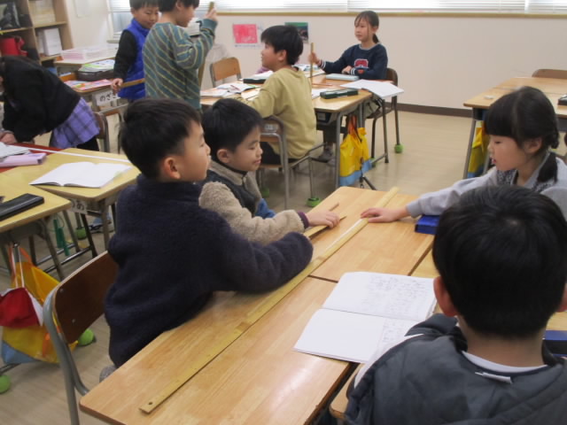 2年生の算数は、長い長さを測る学習をしています。机横2個分ある紙テープの長さは,30㎝ものさしではちょっと不便です。そこで登場したのが1mものさし。これで1mを超える長さも簡単に測れるようになって「いいね!」