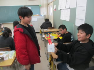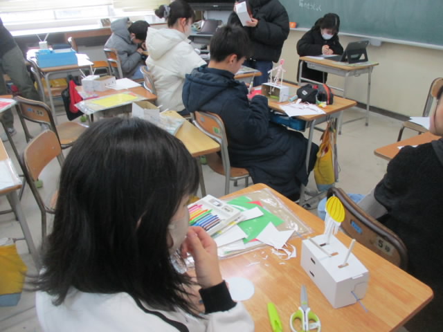 6年生の図工は「くるくるクランク」という工作に取り組んでいます。3つの軸が連動して交互に動くことによって,軸に付けた飾りが楽しい動きをします。軸の動きをイメージしながら,飾りを工夫している姿が「いいね!」