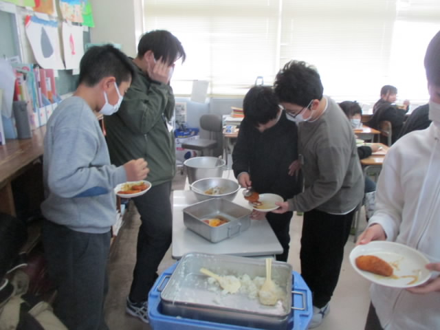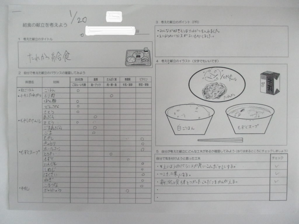 給食週間では,子どもたちからのリクエスト献立があります。今日は,その第1弾6年1組からのリクエスト。大人気のチキンたれかつを主食に,のどごしがまろやかなもずくスープ,さっぱりしたもやしのナムルとバランスのとれたメニューです。たれかつを早く食べたいと盛り付けしている6年生の姿が「いいね!」