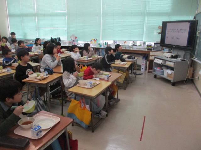 今日は,給食週間最終日。6年生リクエスト献立も最後の3回目です。ピリ辛でご飯が進む野菜たっぷりのキムチスープ,衣がカリッと香ばしい揚げぎょうざ,口当たりさっぱりのナムル。今日も給食クイズを楽しみながら,ピリ辛給食を堪能している3年生が「いいね!」