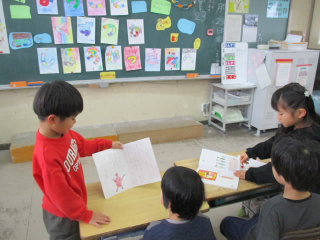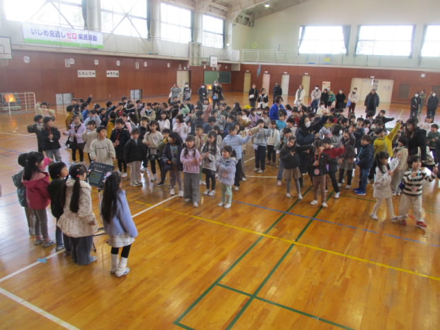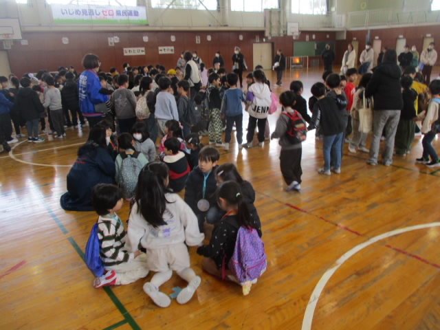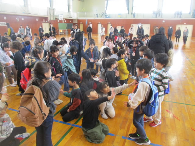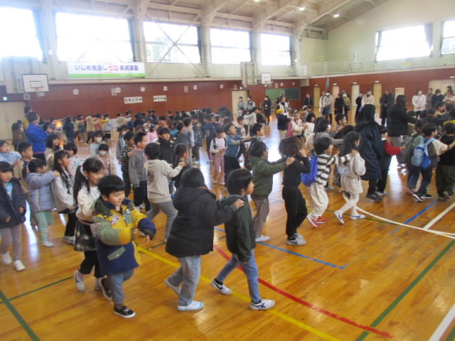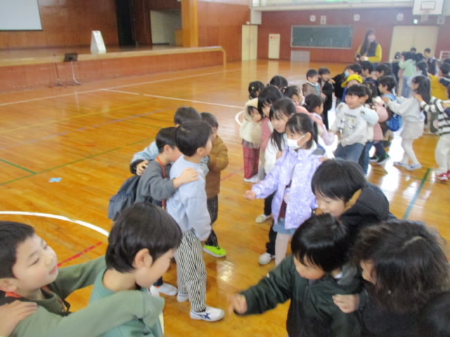 第2部は,体育館で集団ゲームをして一緒に遊びました。ジャンケン列車では,長い列になりながらジャンケンを楽しみました。最後の最前者3人のうち,1人が年長さんでした。次はもうじゅう狩りです。最後にコールされた動物の文字数のグループを作ります。ジンベイザメの6人グループは,なかなか手こずりました。1年生は,ペアの年長さんの手をしっかりと握って動いていました。年長さんが安心して楽しく過ごせるに行動した1年生の姿が「いいね!」