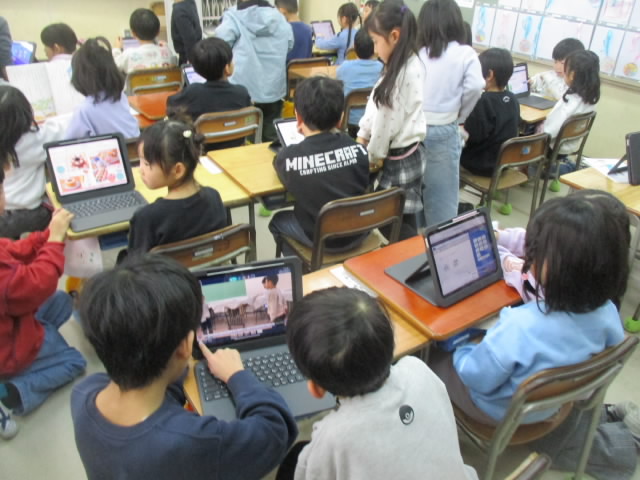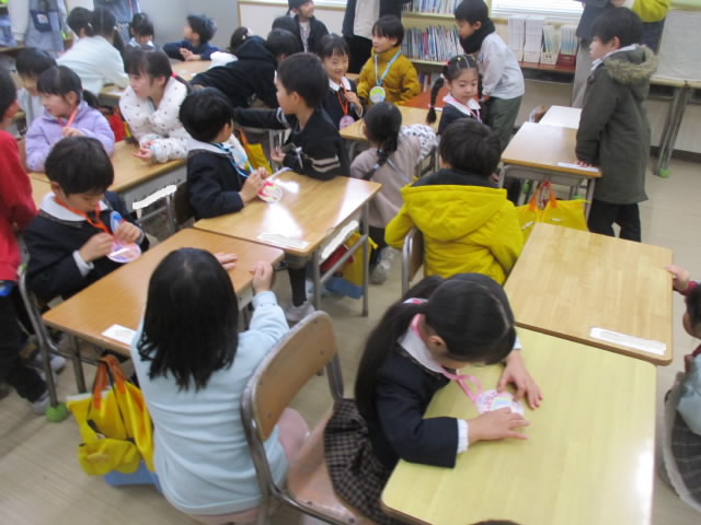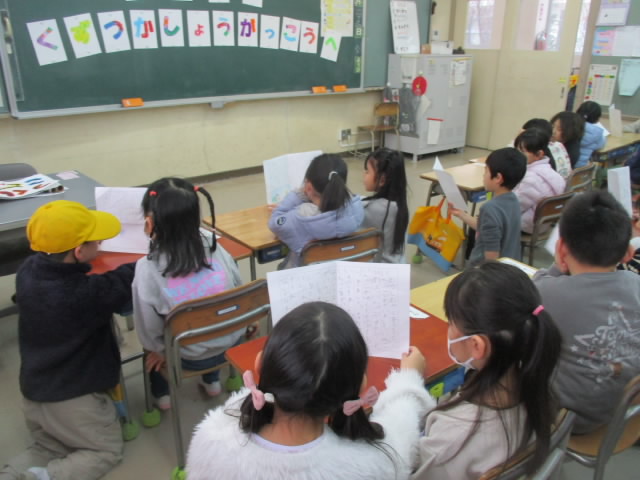 本日,1年生が,来年度葛塚小に入学する園児=年長さんを学校に招待して,交流会を開きました。12の園から60名以上の年長さんが来校しました。第1部は,各教室でまず葛塚小学校の校歌を元気に披露しました。次に,国語の時間で創作したオリジナル昔話をやさしく読み聞かせたり,小学校で勉強する教科書やドリルを見せたり,タブレット端末を一緒に操作したりなどしてあげました。最後に,手作りメダルを渡された年長さんたちの喜んでいる姿が「いいね!」