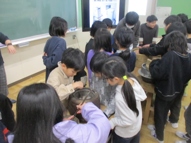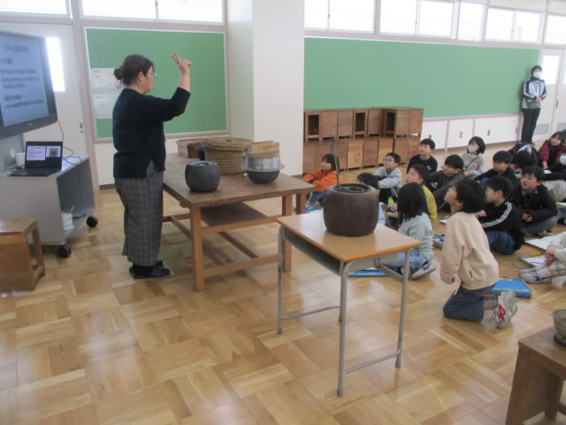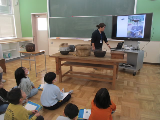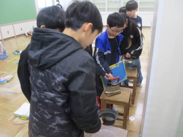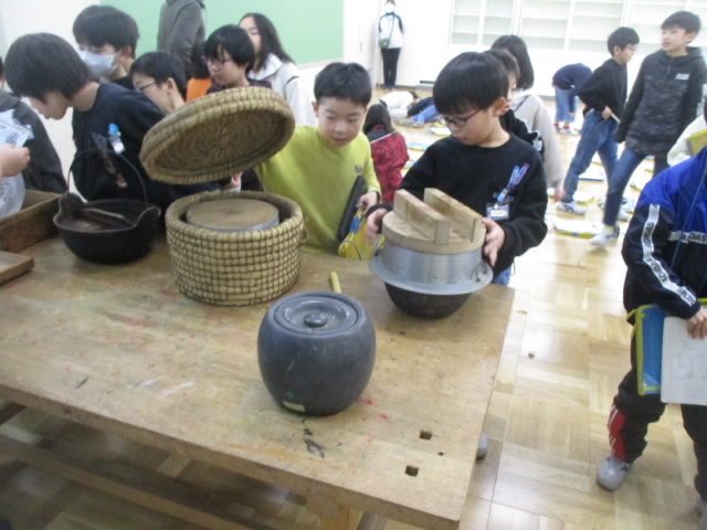 本日,3年生が社会科の学習の一環で,みなとぴあ主催の昔の道具出前授業を受けました。便利な電化製品に囲まれて暮らしている現代から百年ほど遡った時代で使われていた生活道具について,その使い方や役割を丁寧に説明していただきました。最後は,昔の道具を実際に手に取って,その感触を味わいました。昔の生活を想像しながら,今の道具のありがたみも実感できて「いいね!」