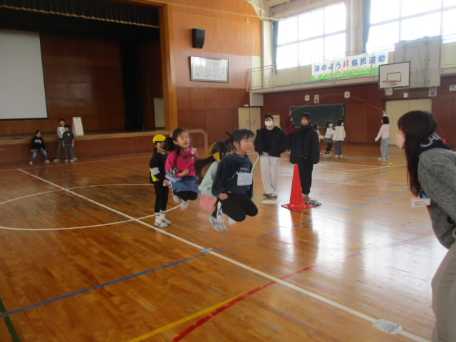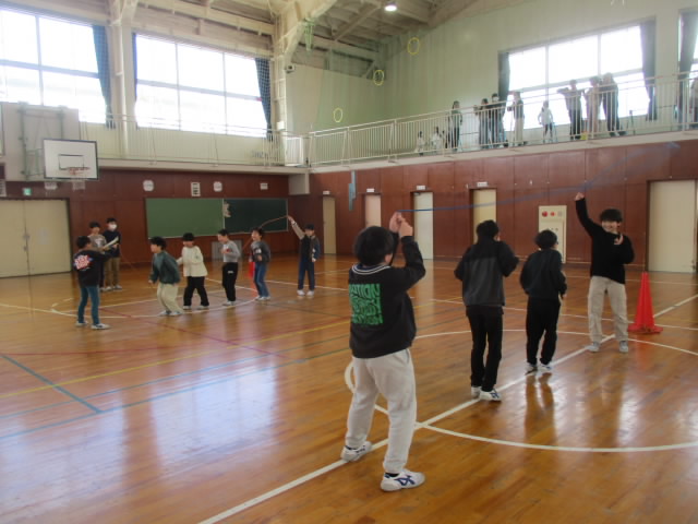 本日の昼休み,児童会運動委員会主催の長縄跳び大会が開催されました。4人以上のチームを組んで自由エントリー制で7チームが参加しました。今日は3分間で連続跳びの回数を競い合いました。回し手と跳び手の息を合わせて跳んでいる姿が「いいね!」