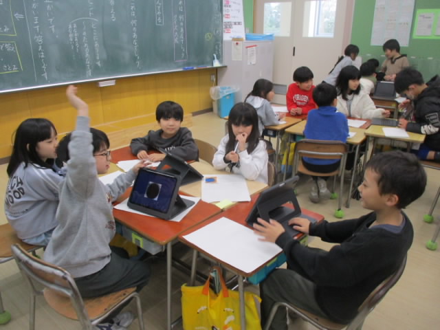 2年生は,国語で「これは何の穴でしょう」というクイズを出し合っていました。身の回りにある「穴」のタブレットで示して,何の穴か,その役割は何かを詳しく説明する学習です。身近な「穴」でこんなに盛り上がるなんて「いいね!」
