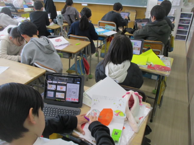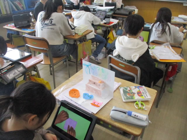 4年生の図工は,「とびだすハッピーカード」を制作しています。開くと,階段状になった中身が飛び出してくるカードです。友達へのメッセージや家族への感謝を伝えるために,素敵な飾りを工夫して作っている姿が「いいね!」