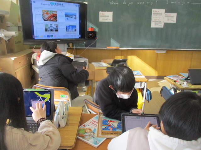 5年生の外国語では,自分が行ってみたい県の名産・名所を,Ilike~,I like to ~,I want to~,You can~の4つの構文で紹介するカードに書いていました。ぜひいつか,そのことができる日が来ると「いいね!」