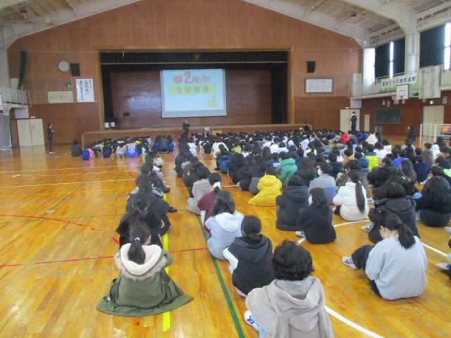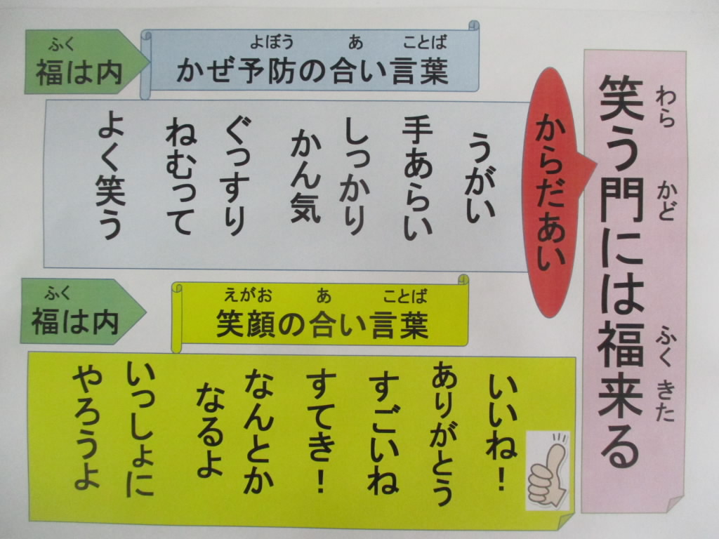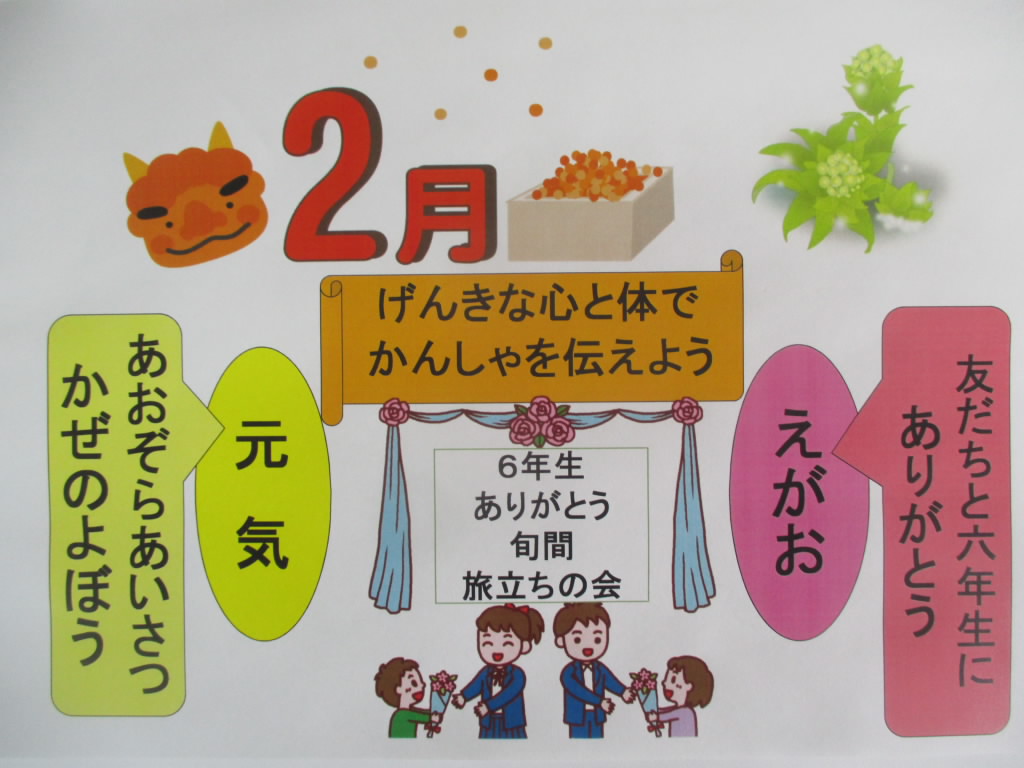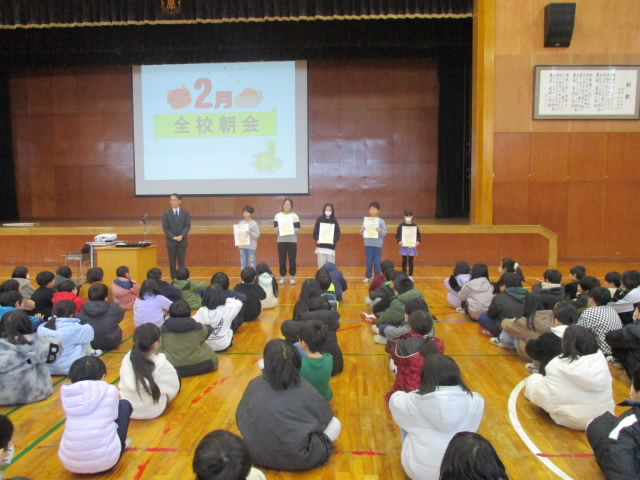 本日は,2月の全校朝会がありました。まず全員で1月の歌「U&I」を元気に心をこめて歌いました。次に新潟教育アート展で優秀賞・奨励賞に入賞した人を表彰し,全員で讃えました。校長講話では,本日が節分であることにちなんで,自分の中にある「鬼」を追い出して,「福」である元気・健康になるための「かぜよぼうの合い言葉」と「笑顔になる合い言葉」を紹介しました。立春とはいえ,まだまだ寒さが続く中,たくさん笑って,福を呼び込めると「いいね!」