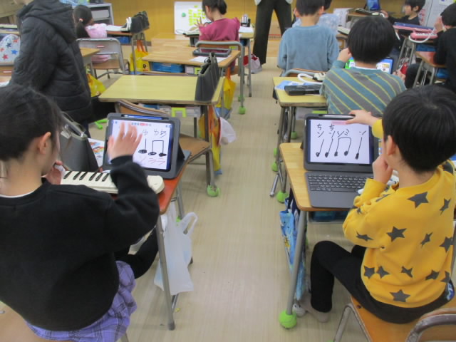 2年生は音楽の時間に,三つの音を使った旋律づくりをしていました。自分の名前に,音階を付けて簡単なメロディーにします。自分の名前が新鮮に聞こえてきて「いいね!」