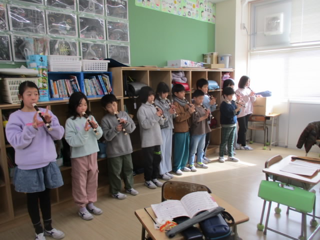 4年生は音楽でリコーダー演奏をしていました。演奏した楽曲の一つの「雨の公園」を輪奏をしていました。教室の前後に分かれて演奏すると,同じメロディーが時間差で重なって「いいね!」