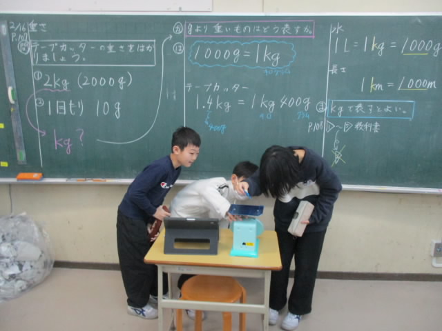3年生は,算数で重さを測る学習をしていました。今日は,1㎏という大きな重さの単位を押さえた後,実際に1㎏を超える重さを測ってみました。4㎏まで測れるはかりで針が振り切らないよう気を付けて測っているところが「いいね!」