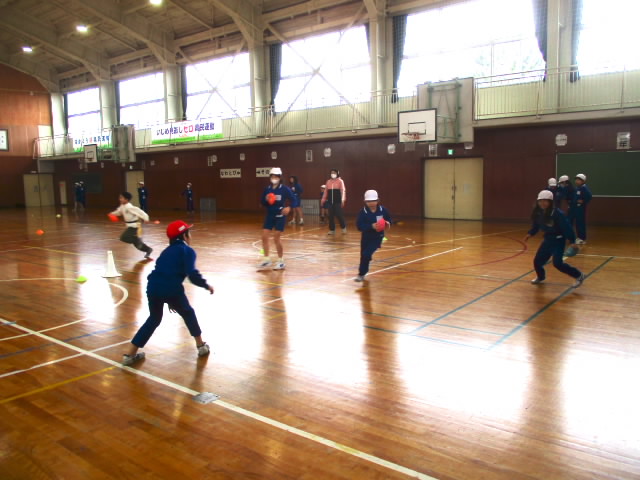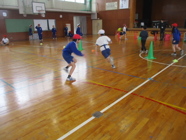 4年生は,体育でタグラグビーをしていました。ズボンの後ろにしっぽのようにタグをつけて,ミニラグビーボールを相手陣地まで運びます。ディフェンスは,走り抜けるときにタグをすばやく捕ろうと手を伸ばしているところが「いいね!」
