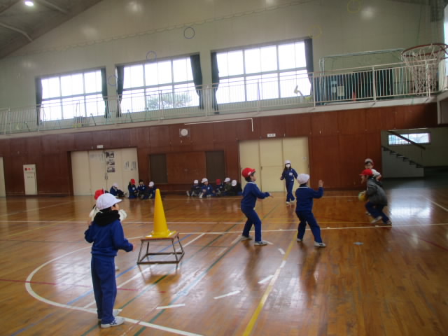 1年生の体育は「ボール当てゲーム」というボールゲームをしていました。中央のコーンを,ディフェンスをよけながら当てるというゲームです。投げる力,捕る力も上がり,ドッヂボールも含め,楽しくボールゲームができるようになって「いいね!」