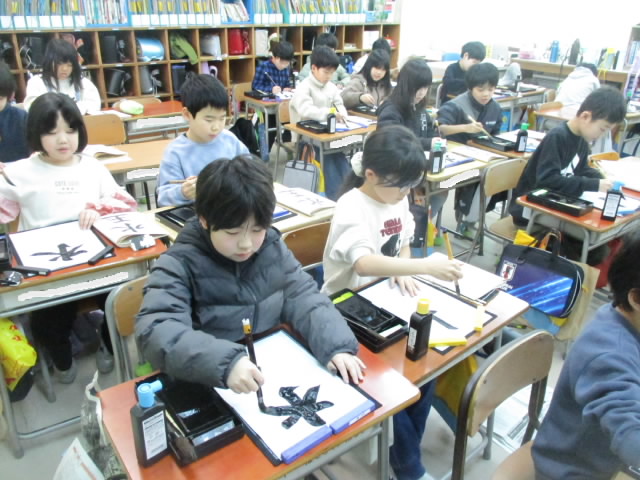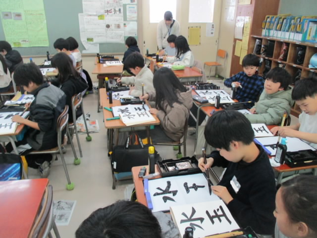 3年生の書写の習字も,漢字二文字のお題になりました。今日書いていた文字は「水玉」。重要なポイントは「水」の右払いです。習字の中では難しい筆づかいの一つです。4月から1年間一生懸命練習してきた成果が出ていて「いいね!」