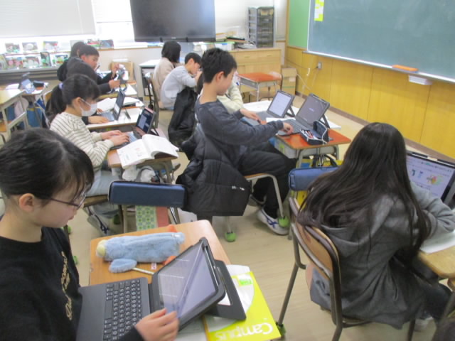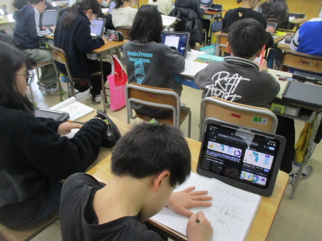 5年生の国語は,資料と関連付けて話す学習に入っています。食品ロスの資料をみて,分ったこととや気付いたことと関連付けて自分の考えを発表します。多くの資料の中から関心のある資料を選び,気付きや考えをロイロノートにまとめている姿が「いいね!」