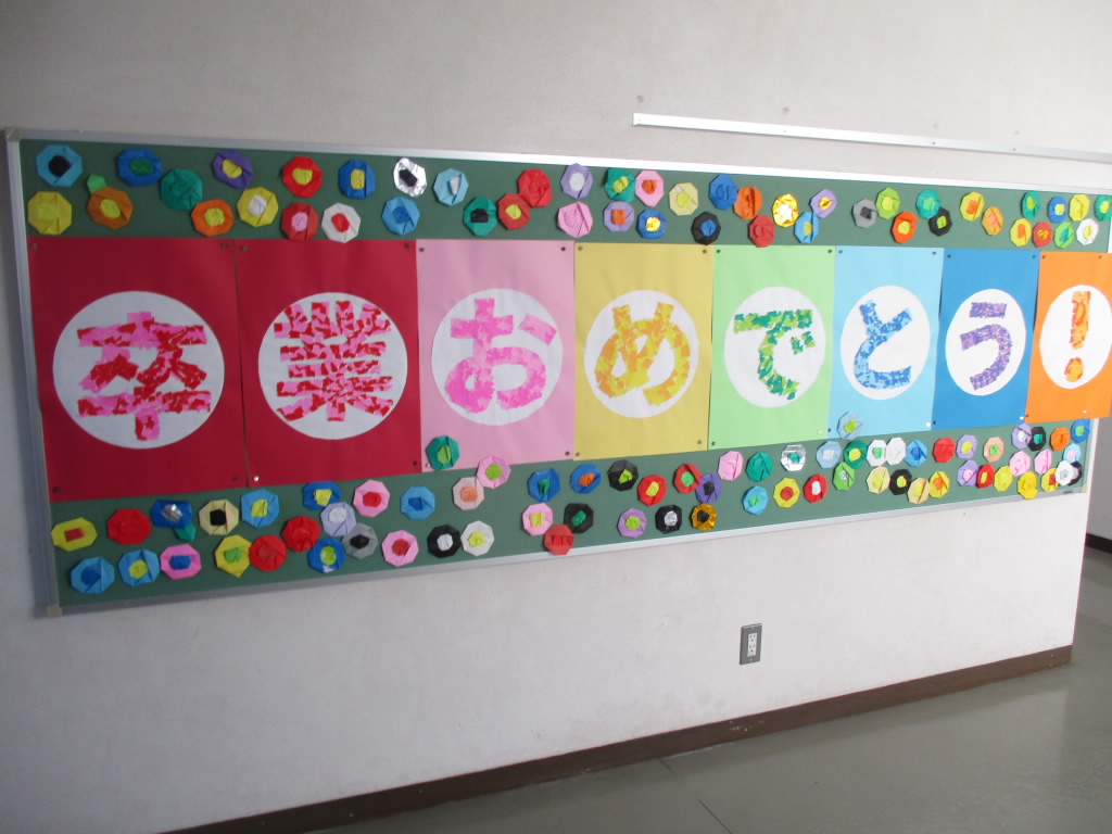 職員玄関脇の掲示板には,1年生による,折り紙のお花がいっぱいの6年生へのお祝い掲示です。色とりどりで見ていると楽しくなって「いいね!」