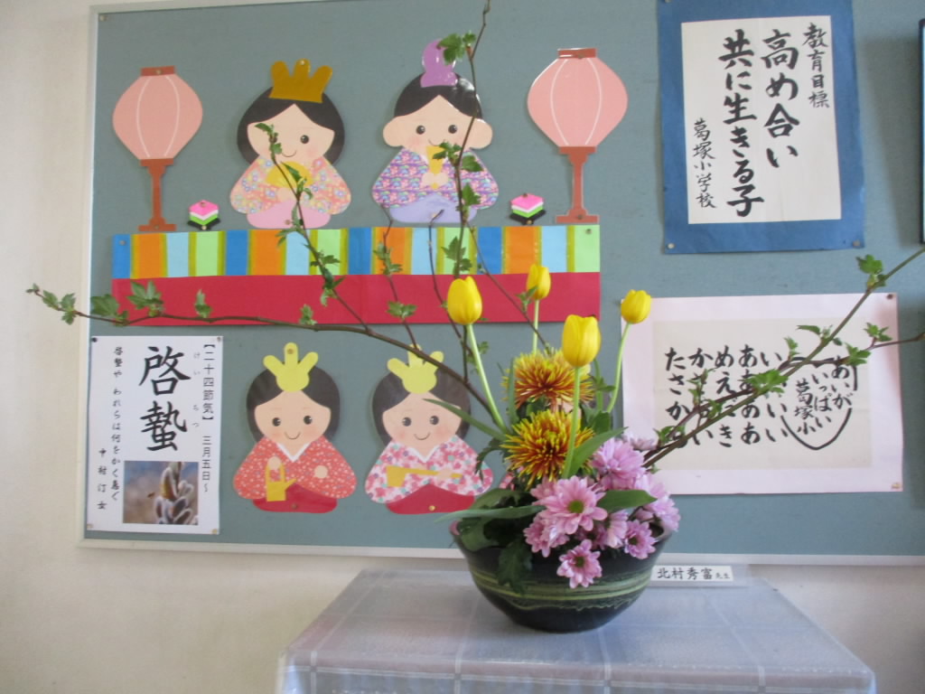 今日から啓蟄。地中に籠っていた虫たちもうごめき始めます。お雛様の掲示をバックに,黄色いチューリップを中心とした生け花が映えて「いいね!」