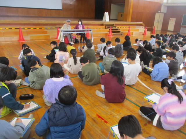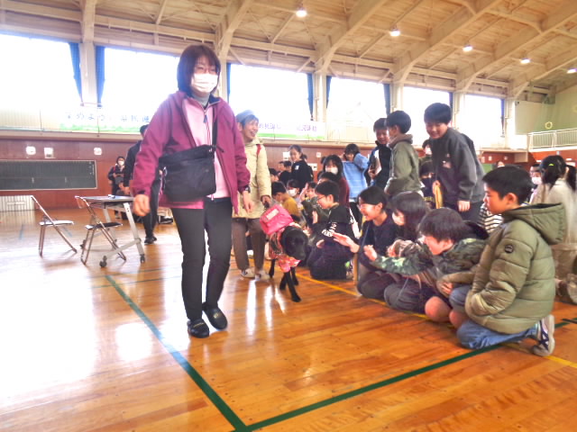 4年生は,総合の学習で目の不自由な方をお招きして,苦労したことや克服したことなど様々な体験談をお話しいただきました。その方の盲導犬も一緒に連れてきてくださり,子どもたちも興味津々に触れ合って「いいね!」