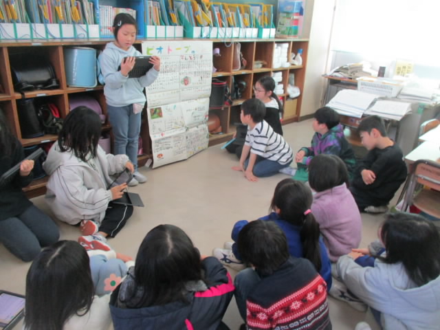 3年生は,総合の学習で,2年生に向けてビオトープの生き物について調べたことを発表していました。新年度から総合の学習が始まる2年生は,その予習として3年生の発表を真剣に聞いている姿が「いいね!」