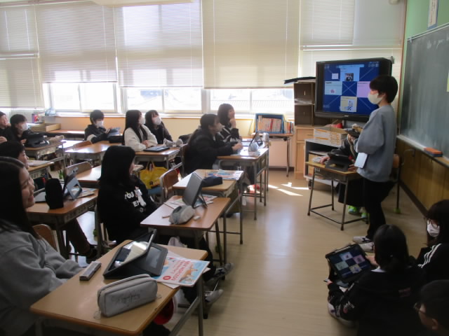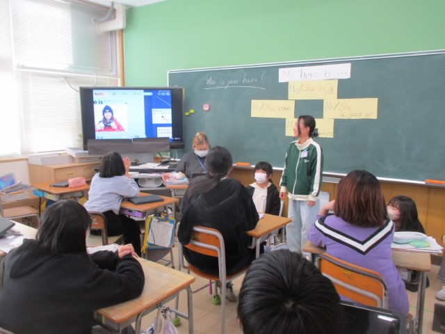 5年生は外国語科で,Who is your hero?の発表をしていました。My hero is~.He/She is ~.can ~.is good at ~.is always ~.という4つの構文で,自分の憧れの人をはきはきとした発音で発表する姿が「いいね!」