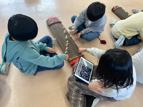 音楽室からすてきな音色がもれ聞こえてきました。 琴が奏でるその音色は、「さくら さくら」。音楽室の扉を開けると、お正月の和風レストラン(!?)のような気持ちに。 小学校の音楽は、日本の音楽に親し …
