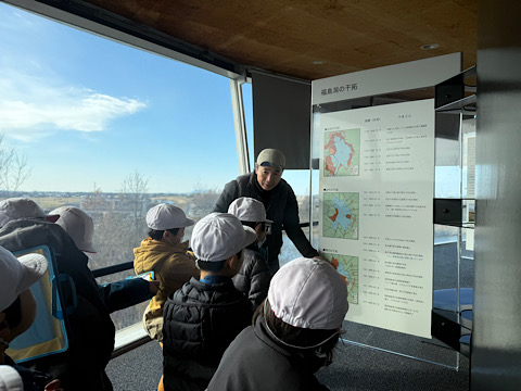バスを利用して福島潟に向かった校外学習組。ビュー福島潟の館内を巡り、潟の歴史や生き物、文化についての説明を受けました。 屋外で野鳥観察をしたグループは、カウンターを用いながら、福島潟に飛来して …