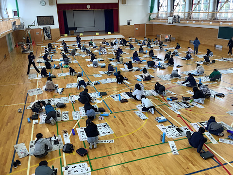 毛筆の3〜6年生は体育館、硬筆の1、2年生は教室で。 新年の書き初めを行いました。 程よい緊張感と肌寒さ。琴の音色が聞こえる中、集中して臨みました。 13日、14日と2日間に分けて各学年で行 …