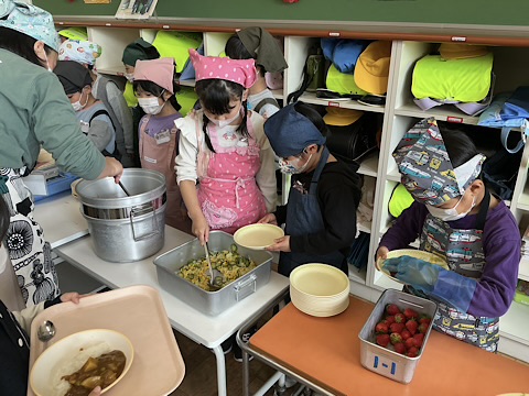 マスクやエプロン等、身支度を整え、給食の準備を始めました。 「いいにおいがするね。」「カレーだよ。」「おなか空いたよー。」 そんな声も聞こえてきました。 盛り付けボランティアさんや2年生の …